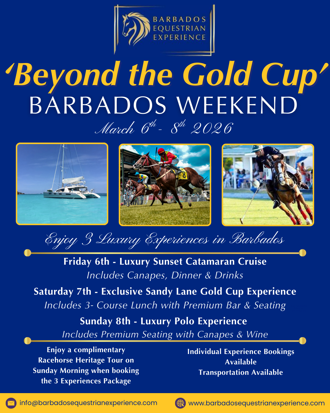 For those seeking the highlight moments of Gold Cup week without a full retreat, Beyond the Gold Cup offers a refined luxury weekend experience focused on celebration, style, and access. curated experience includes VIP Sandy Lane Gold Cup race day, VIP polo, and a private luxury catamaran - designed for guests who want to enjoy Barbados’ most iconic events at their most elevated.